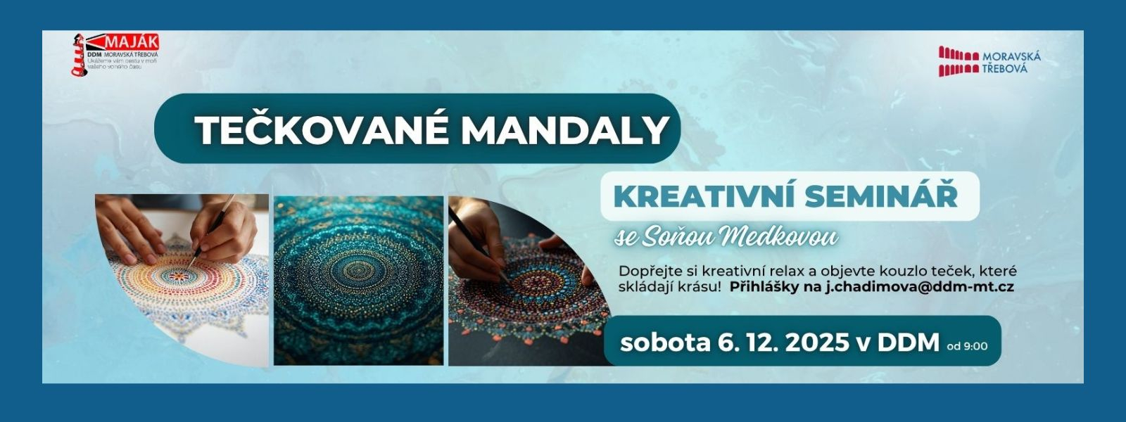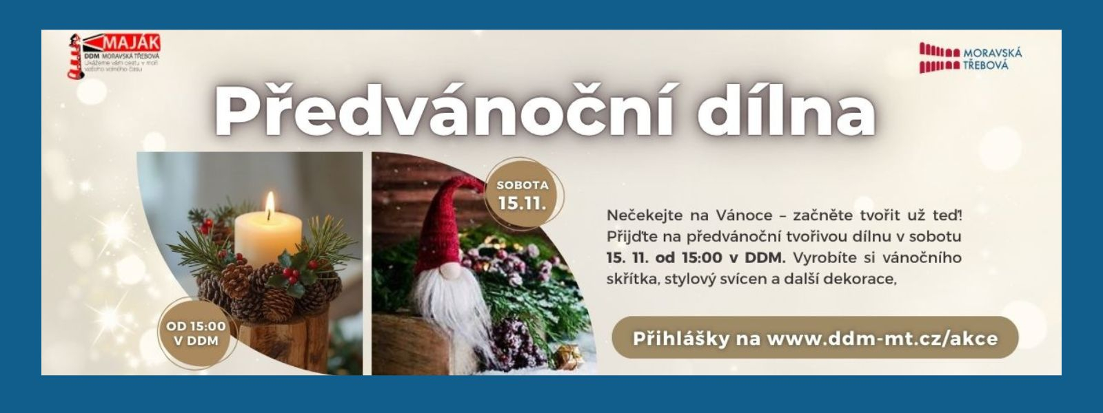 Pojďte si s námi vyrobit Vánoce podle svého… Advent se blíží a s ním kouzlo světýlek, vůně jehličí a chvíle společné pohody. Zveme vás na předvánoční tvoření 15. listopadu od 15:00 v DDM, kde si vyrobíme roztomilé skřítky, hřejivé svícny i další zimní drobnosti, které rozzáří váš domov i srdce. U šálku čaje a dobré nálady strávíme společně čas, zpomalíme a naladíme se na advent. Cena: 150 Kč (materiál + lektor + malé občerstvení) Pro děti i dospělé (děti do 6 let s doprovodem) Přihlášky: www.ddm-mt.cz/akce Počet míst je omezen – rezervujte si to své včas!