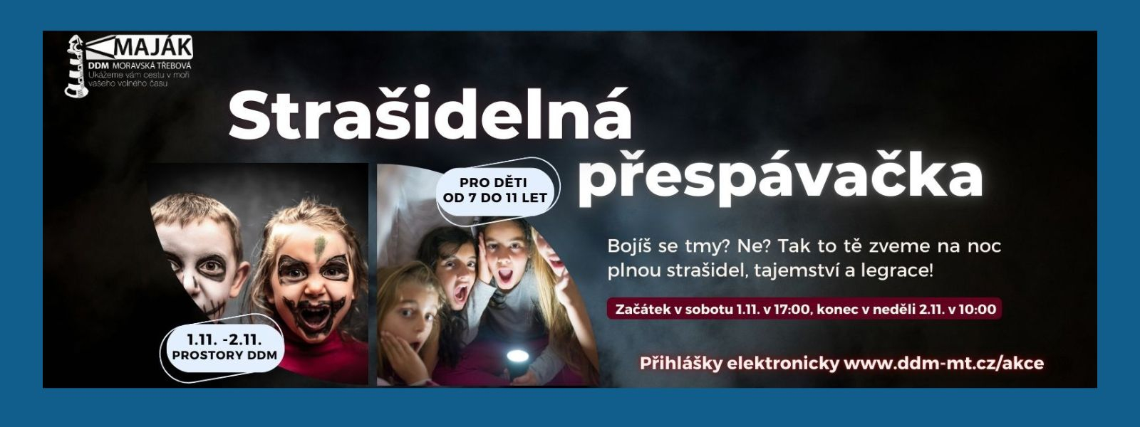 Rádi bychom Vás informovali, že během podzimních prázdnin zájmové kroužky neprobíhají. Pro děti jsme připravili dvě celodenní akce a přihlašování bude ukončeno ve čtvrtek 23. října.