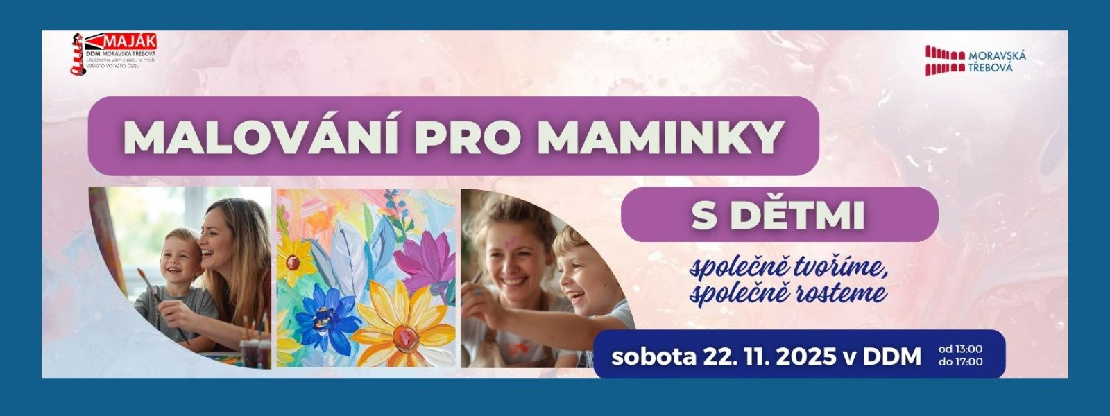 MALOVÁNÍ PRO MAMINKY S DĚTMI – od 13:00 do 17:00 v DDM. Přijďte si užít tvořivé odpoledne plné pastelových barev a fantazie – společně s dětmi (4+) si namalujete vlastní obraz na plátno formátu A3 akrylovými barvami. Těšíme se na vás – přijďte si odpočinout, tvořit a odnést si domů krásnou společnou práci. Tvořivým odpolednem vás provede lektorka Katka Květenská. Kapacita omezena přihlaste se přes web DDM, občerstvení zajištěno, cena 150Kč dospělý , dítě zdarma,