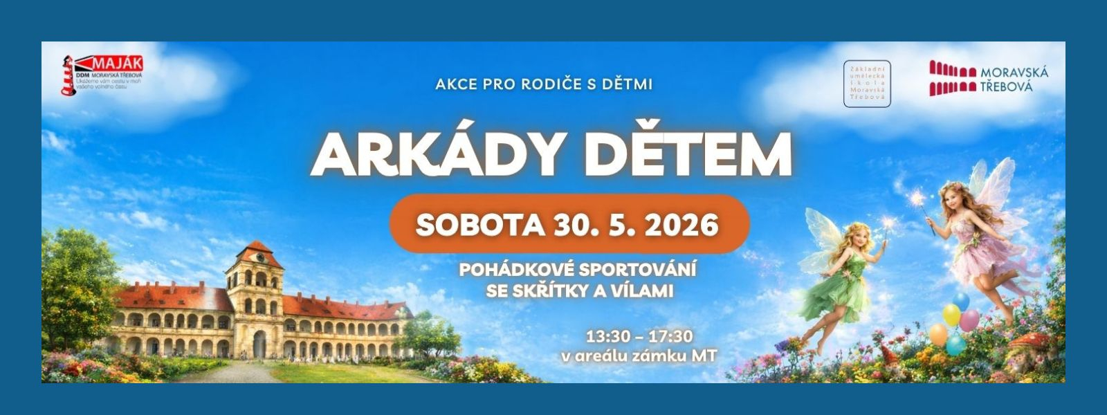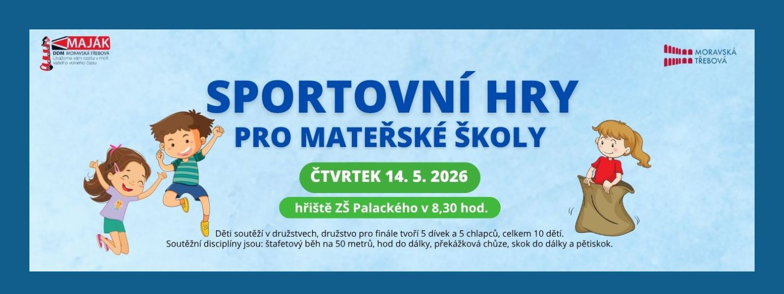 Sportovní hry pro mateřské školy proběhnou 14.5.2026 od 8:30 hod. Děti soutěží v družstvech. Soutěžní disciplíny jsou: štafetový běh na 50 metrů, hod do dálky, překážková chůze, skok do dálky a pětiskok. Těšíme se na vás...