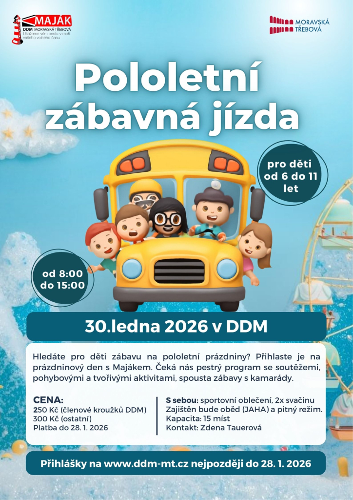Vítáme vás v novém roce a těšíme se na setkání nejen v kroužcích, ale také například během pololetních prázdnin. Pokud ještě nemáte plán, mrkněte na naši zábavnou jízdu, kterou připravujeme.