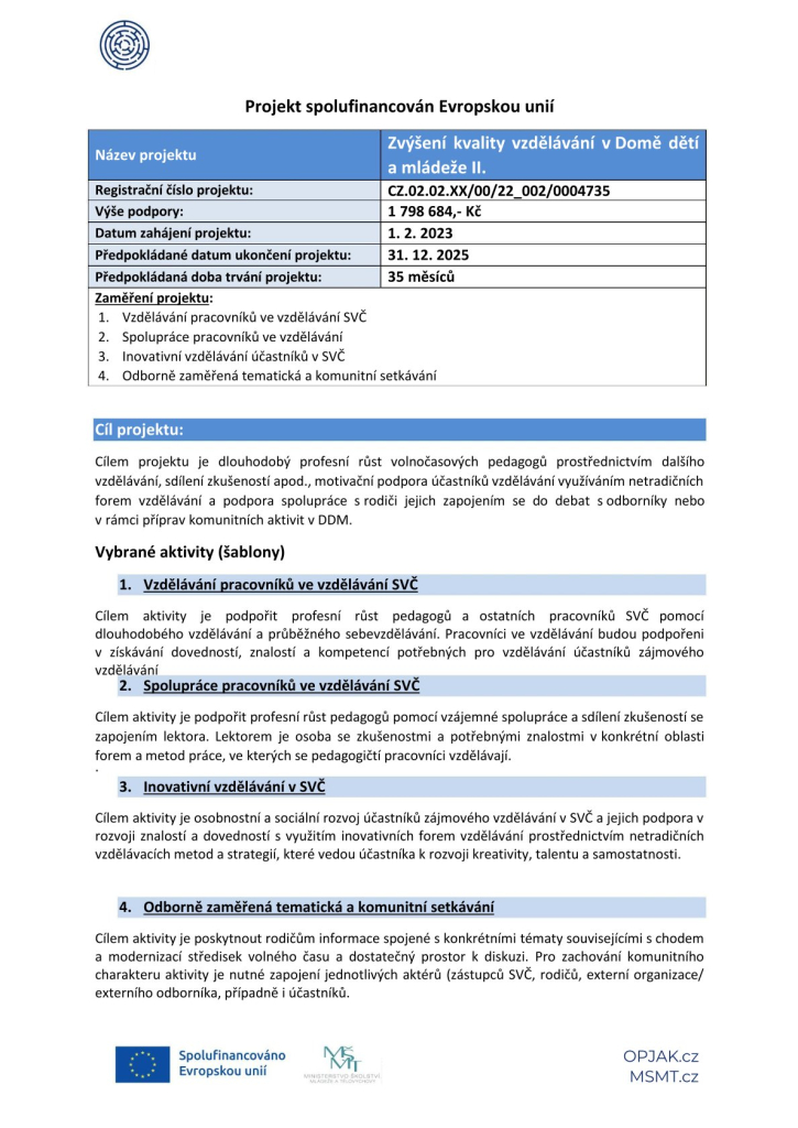 Cílem projektu je dlouhodobý profesní růst volnočasových pedagogů prostřednictvím dalšího vzdělávání, sdílení zkušeností apod., motivační podpora účastníků vzdělávání využíváním netradičních forem vzdělávání a podpora spolupráce s rodiči jejich zapojením se do debat s odborníky nebo v rámci příprav komunitních aktivit v DDM.
