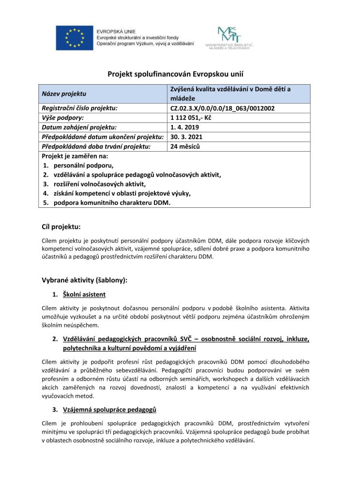 Cílem projektu je poskytnutí personální podpory účastníkům DDM, dále podpora rozvoje klíčových kompetencí volnočasových aktivit, vzájemné spolupráce, sdílení dobré praxe a podpora komunitního účastníků a pedagogů prostřednictvím rozšíření charakteru DDM.